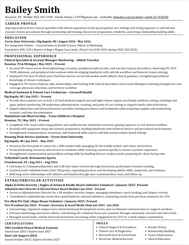 This resume outlines my clinical experience, leadership roles, and exposure to medical device sales, along with the skills I’ve developed in patient care, communication, and relationship building.
